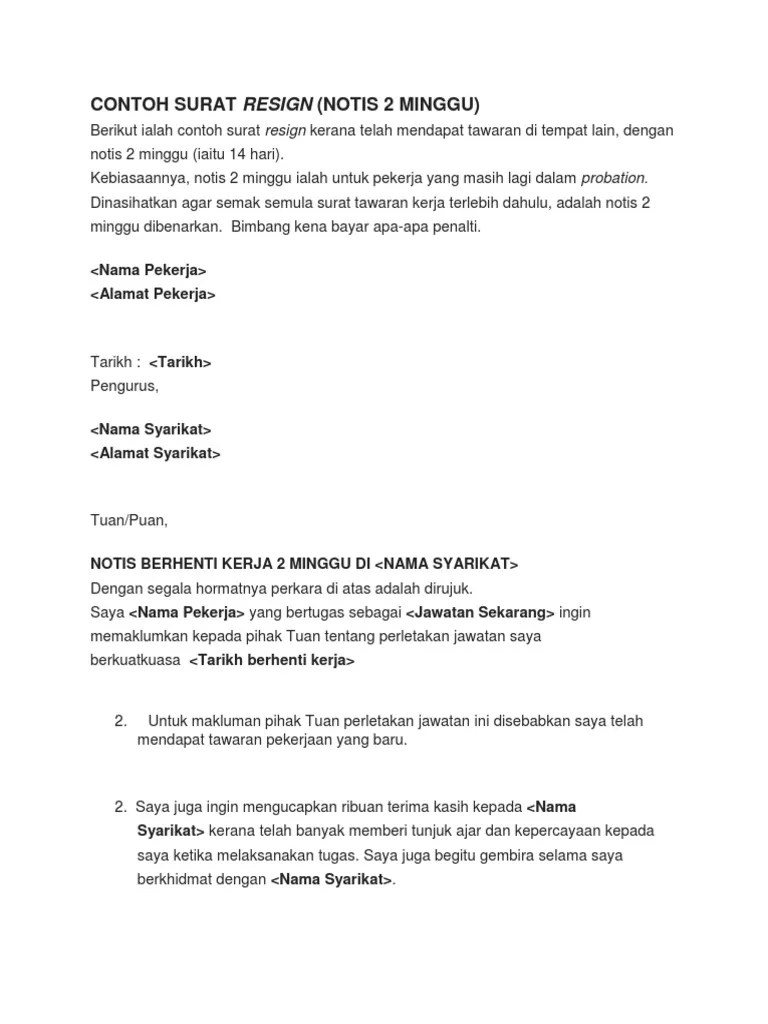 Dinasihatkan agar semak semula surat tawaran kerja terlebih dahulu . Contoh surat berhenti kerja mudah dan ringkas, surat perletakan jawatan,. Contoh surat berhenti kerja notis dua minggu yang baik dan benar. Perletakan jawatan saya adalah kerana. Link download template surat berhenti kerja dalam pelbagai sektor dalam bm bi.